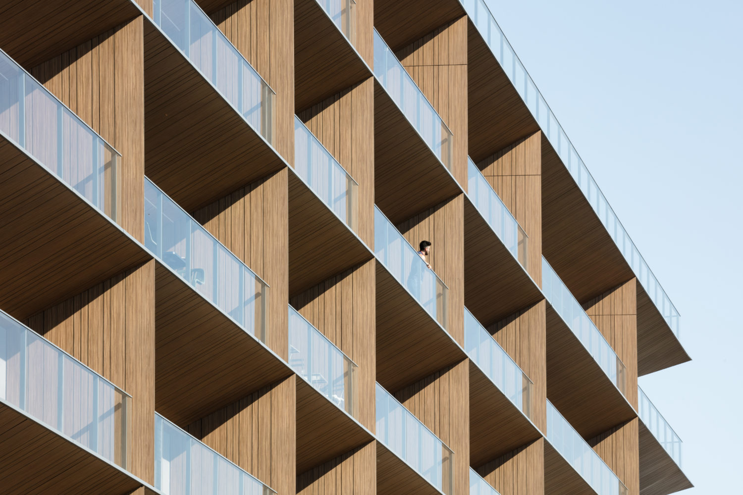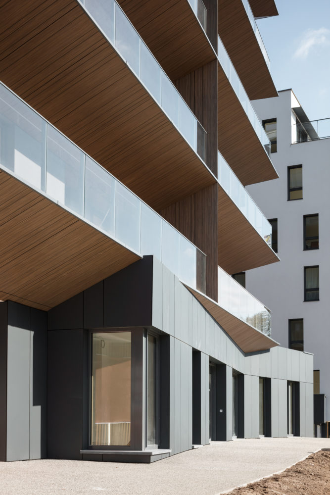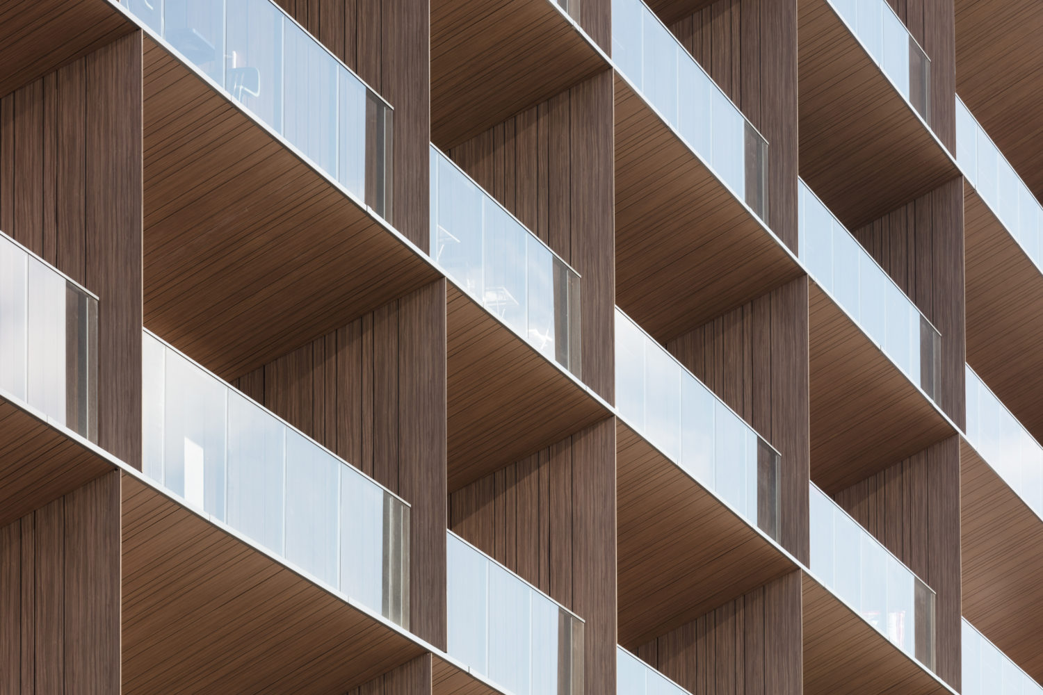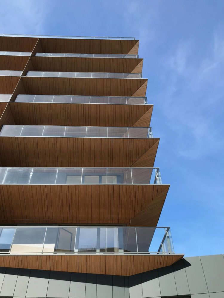 Awarded in 2012 as an Exemplary Building (BATEX), Les Balcons is also an example of façades that were sculpted by natural light. Wishing to maximize openings and exterior views while providing sun protection in the summer, wooden triangular profiles forming the ceilings and metal structures dressing sides of terraces were specially designed and placed between floors and homes. Such is the way in which all apartments receive both optimal daylight and optimized visual perspectives on the surrounding environment.