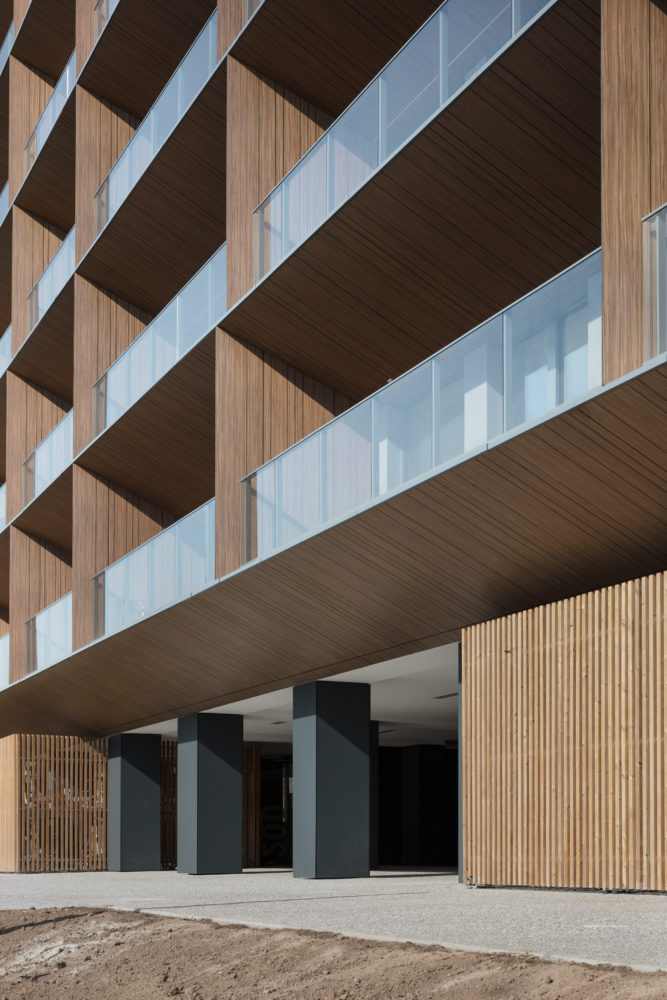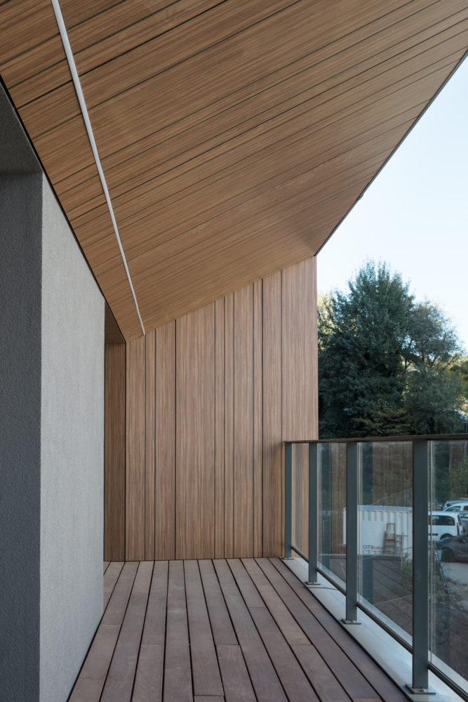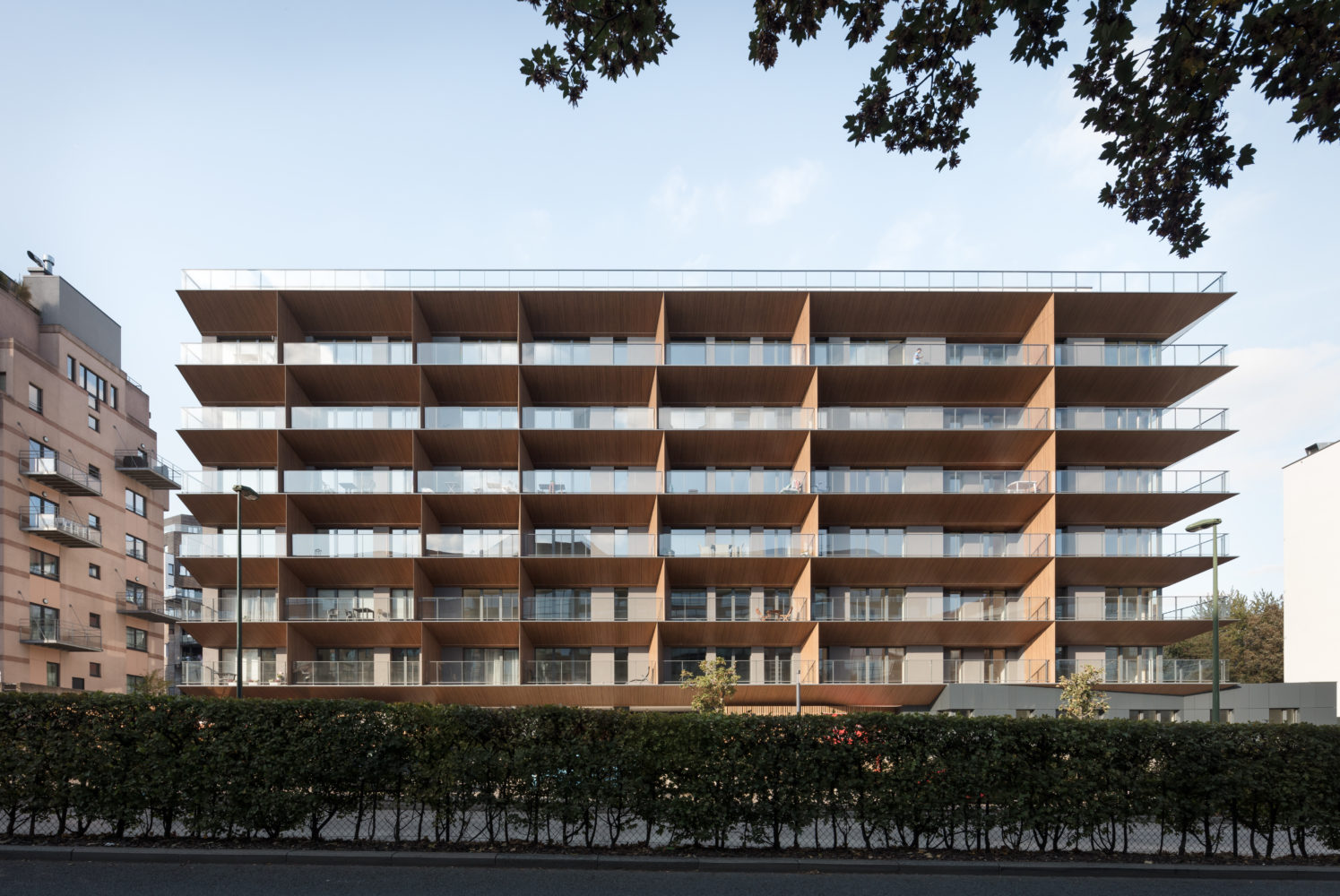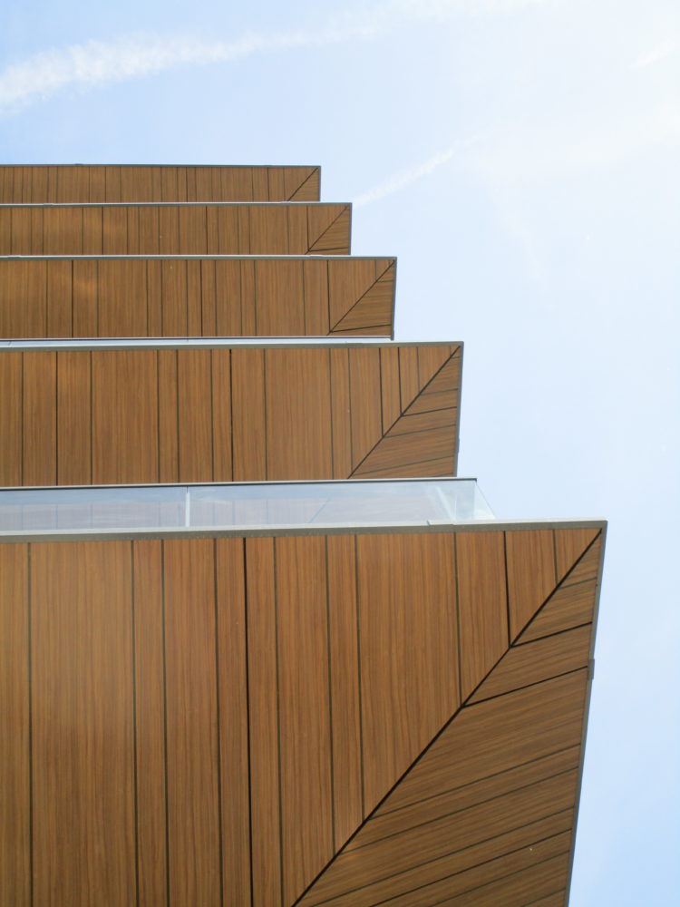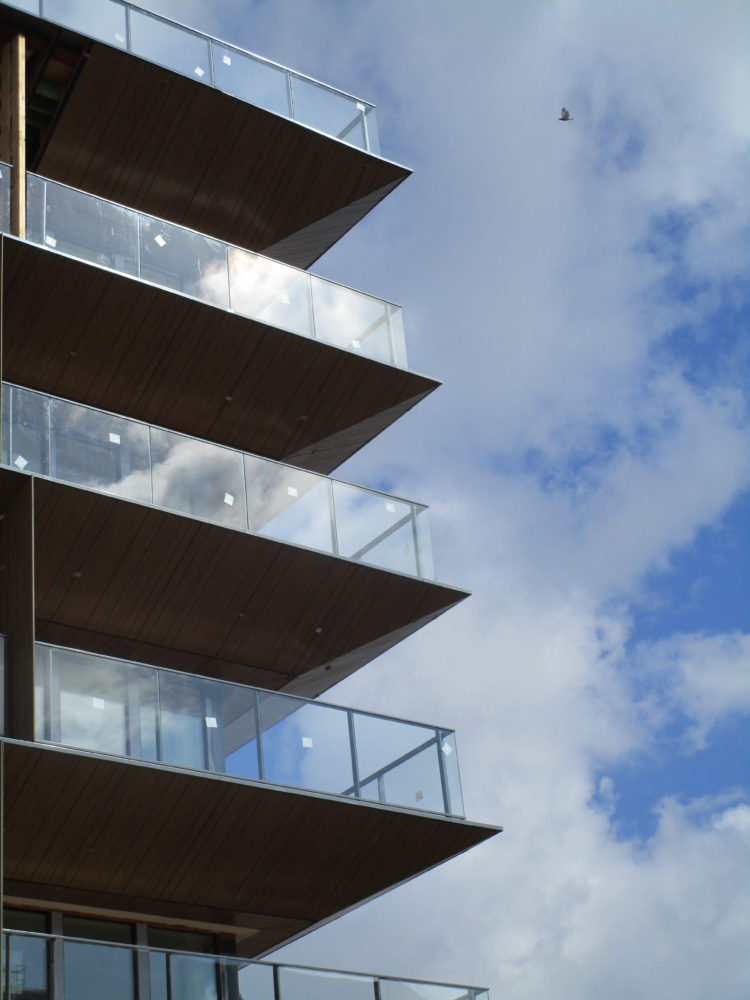 Awarded in 2012 as an Exemplary Building (BATEX), Les Balcons is also an example of façades that were sculpted by natural light. Wishing to maximize openings and exterior views while providing sun protection in the summer, wooden triangular profiles forming the ceilings and metal structures dressing sides of terraces were specially designed and placed between floors and homes. Such is the way in which all apartments receive both optimal daylight and optimized visual perspectives on the surrounding environment.