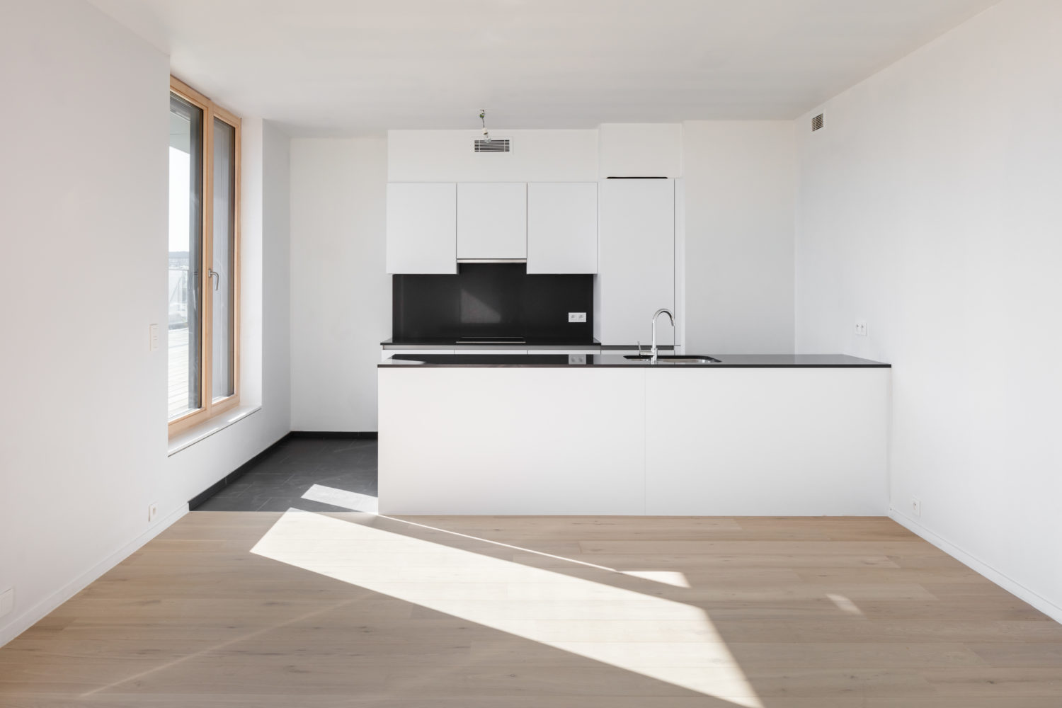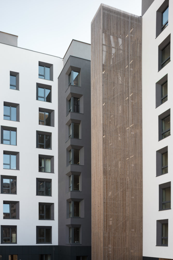 This transformation project serves its residential function by deploying 85 housing units spread over a total of 8 levels on the main building and 6 levels on the new building. Ground floors are activated with shops and office areas. The first extension allowed the main building to stretch into the west, and benefited from a deep renovation required to achieve the passive house standard. The second extension led to the creation of an entirely new building.
