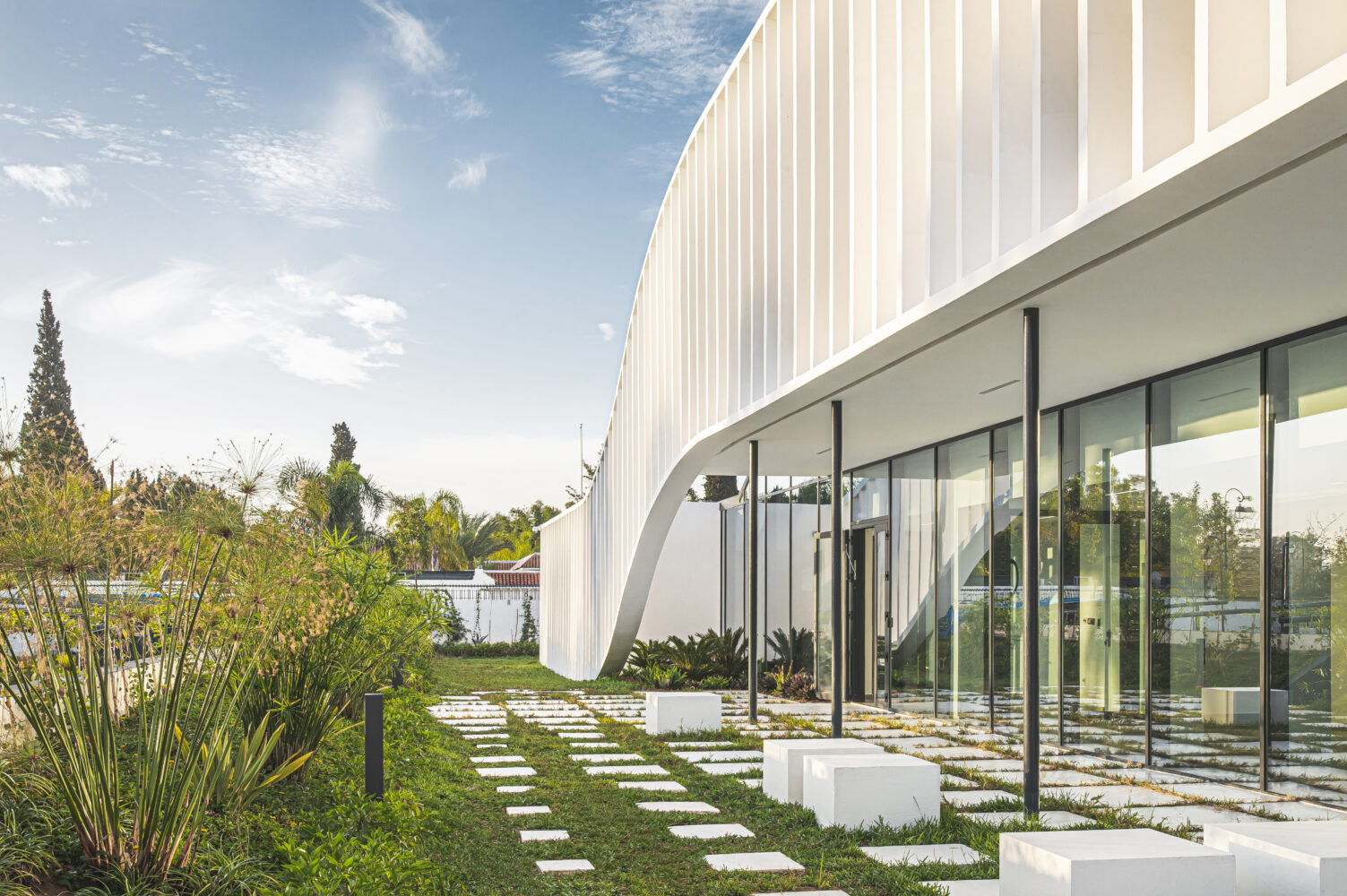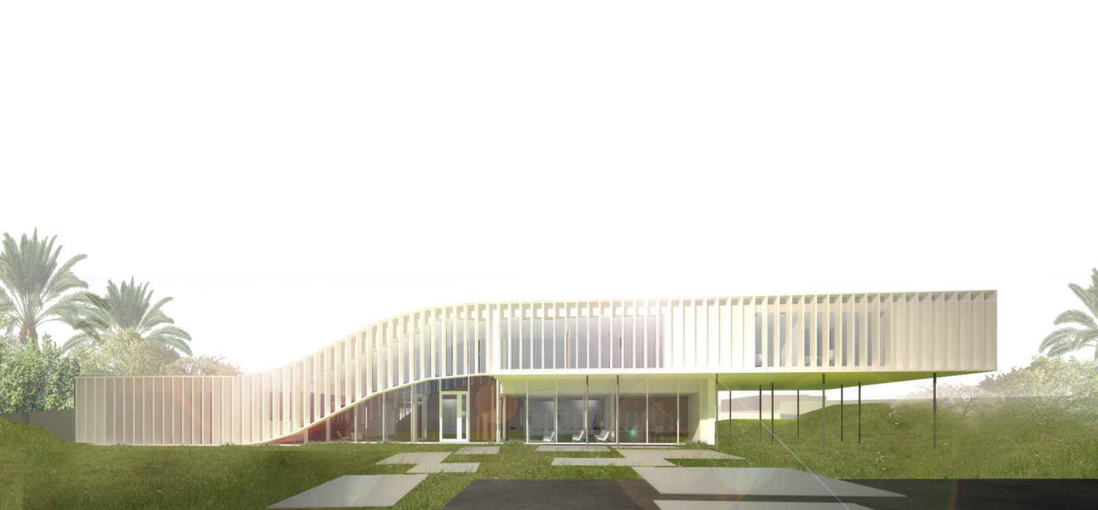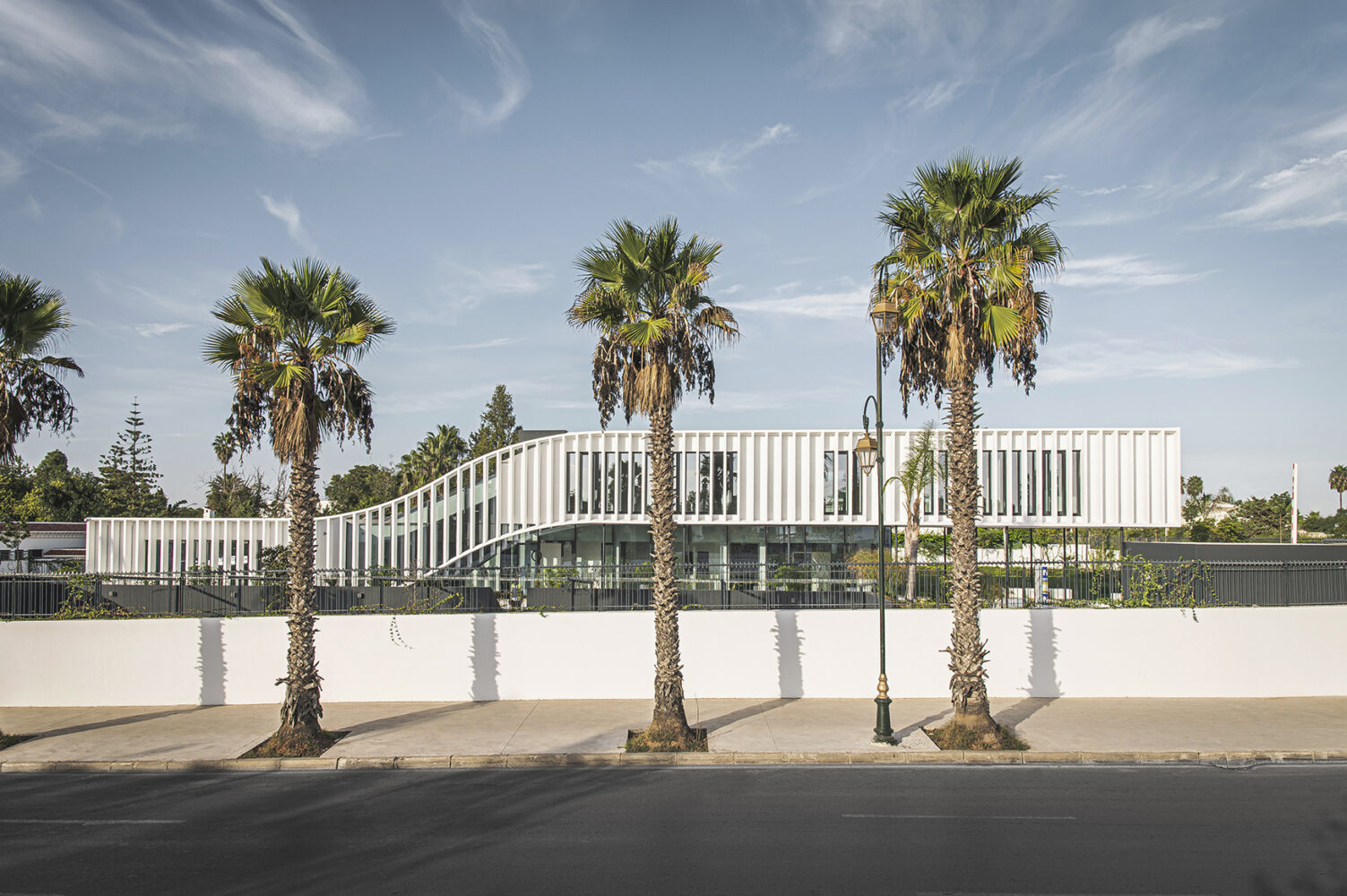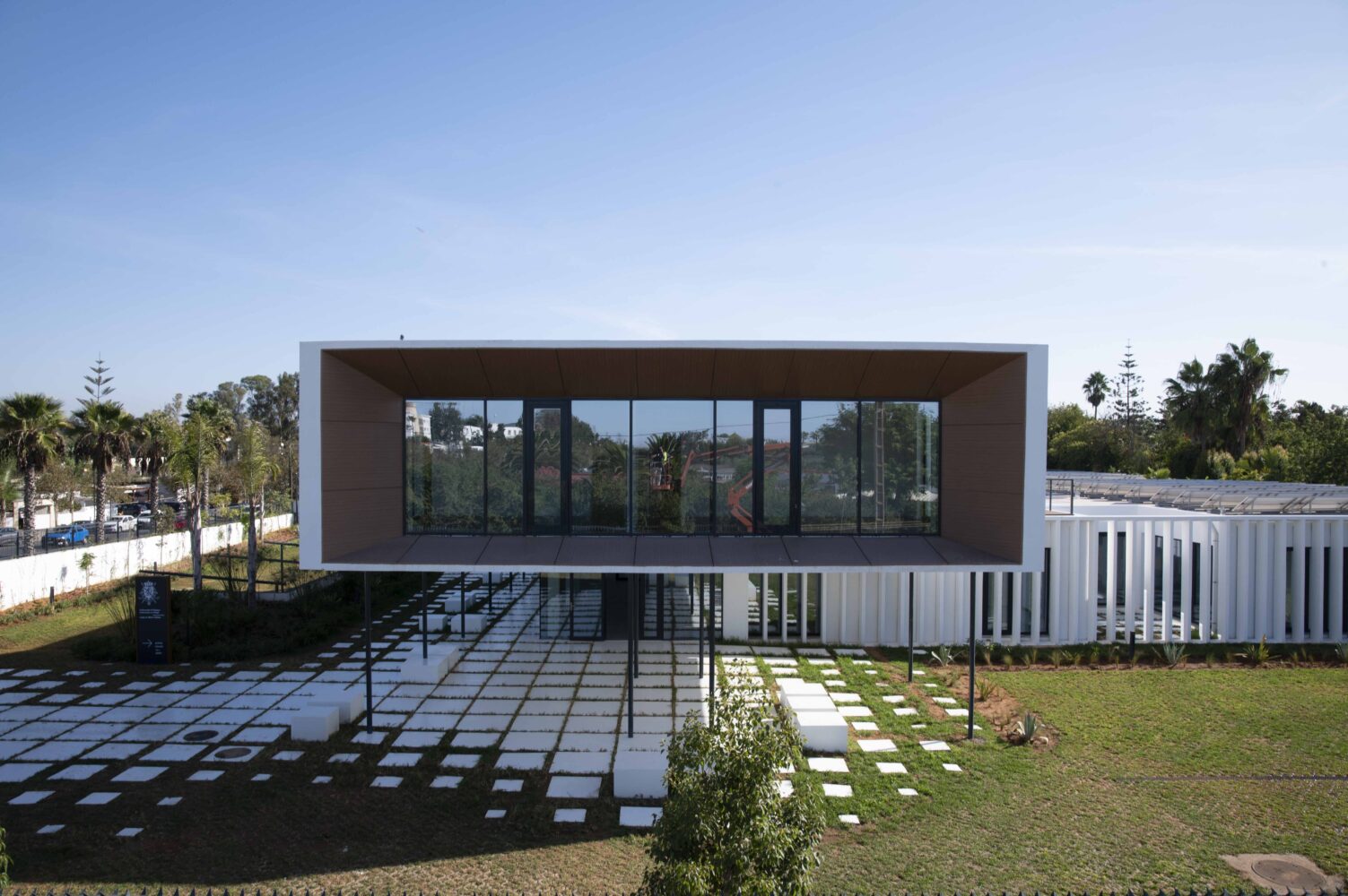 The riad – a typical, vernacular flat volume used to create courtyards – was used as the basis of the composition. Construction proceeded by lifting part of this volume for the reception area, creating a unique shape meant to become a city landmark. The project incorporates time-tested solutions for sun protection such as fixed, vertical sunshades and meets Passive House, net zero energy as well as BREEAM Excellent standards.