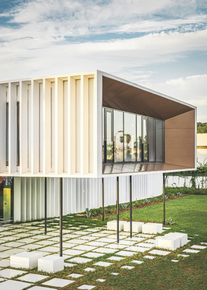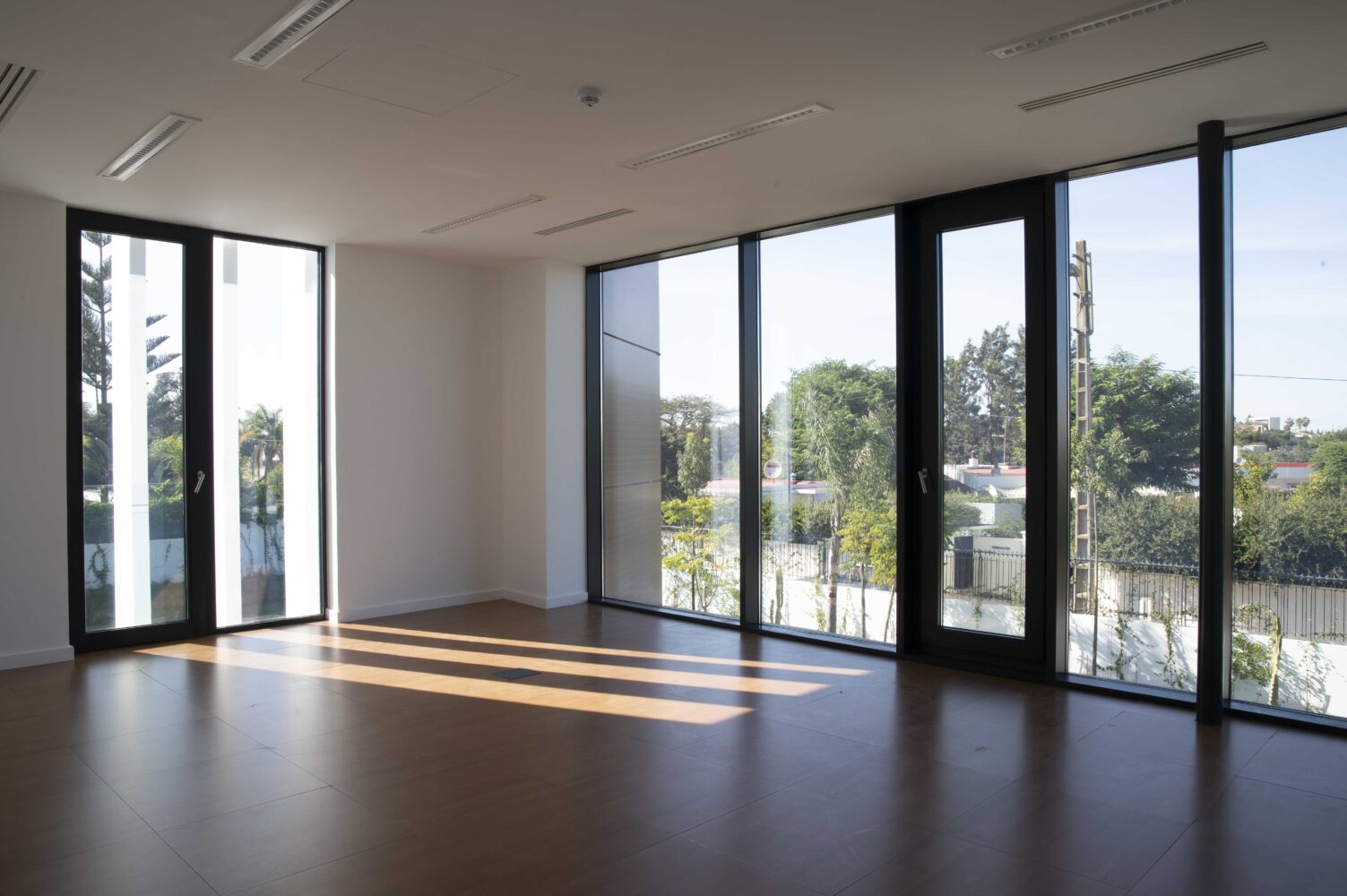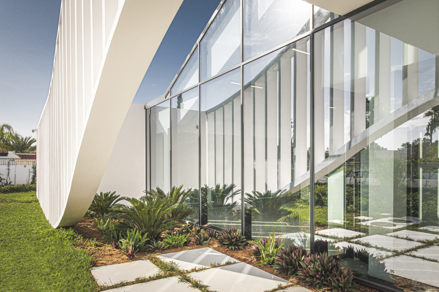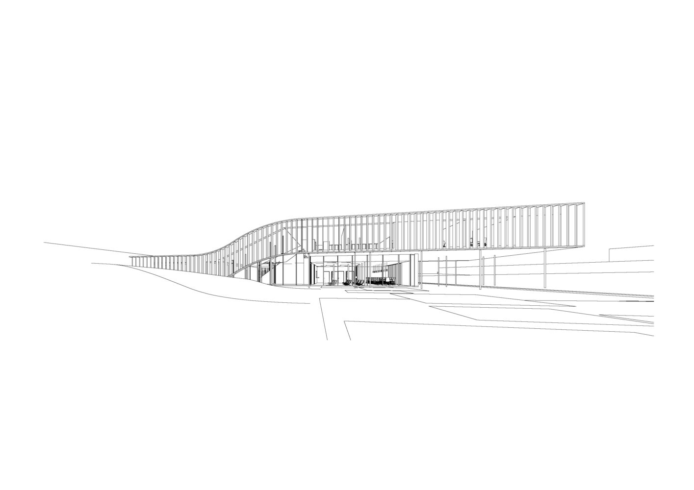 The riad – a typical, vernacular flat volume used to create courtyards – was used as the basis of the composition. Construction proceeded by lifting part of this volume for the reception area, creating a unique shape meant to become a city landmark. The project incorporates time-tested solutions for sun protection such as fixed, vertical sunshades and meets Passive House, net zero energy as well as BREEAM Excellent standards.